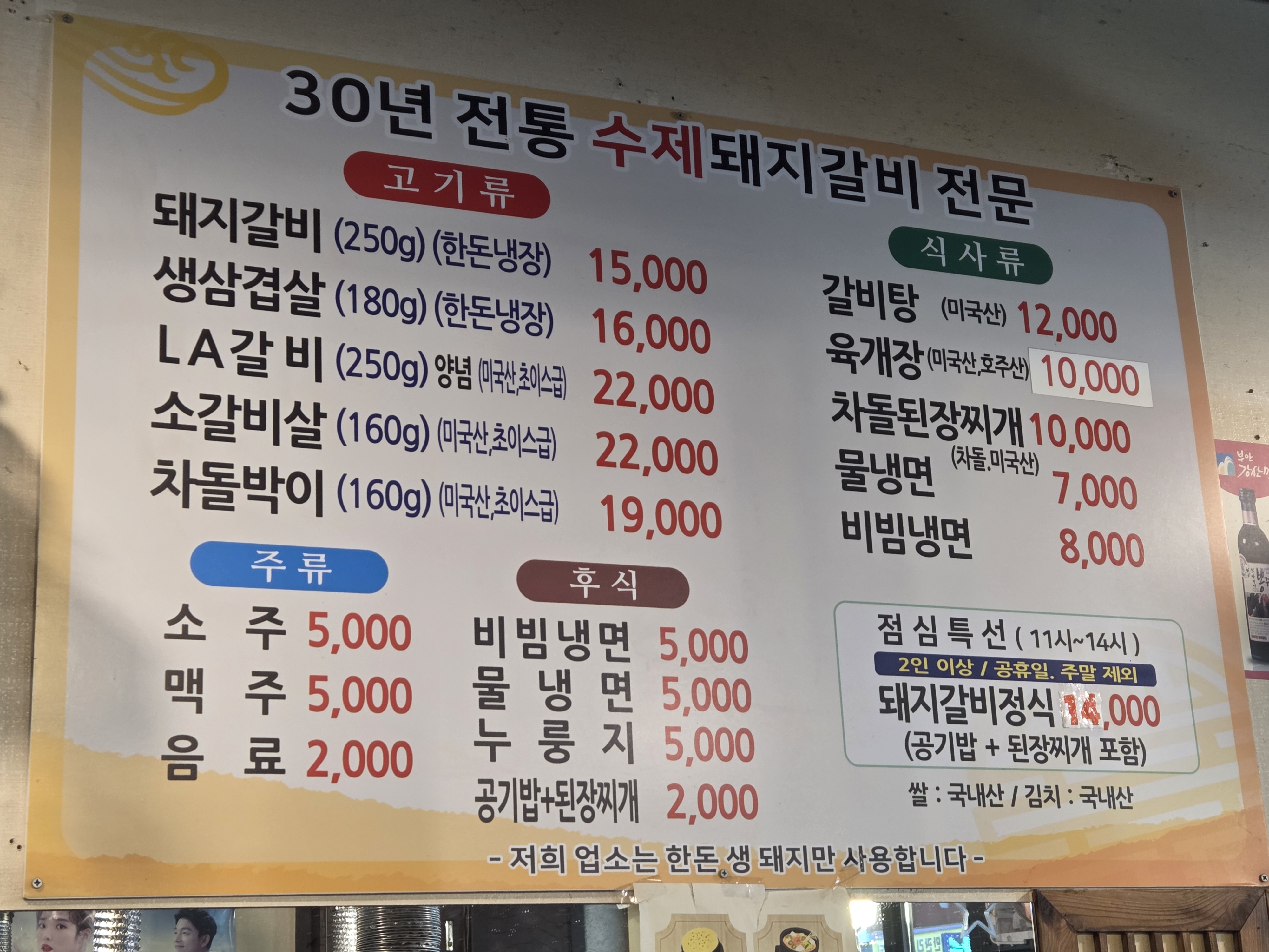 주요 메뉴: 돼지갈비(15,000원), LA갈비(22,000원), 점심특선 등